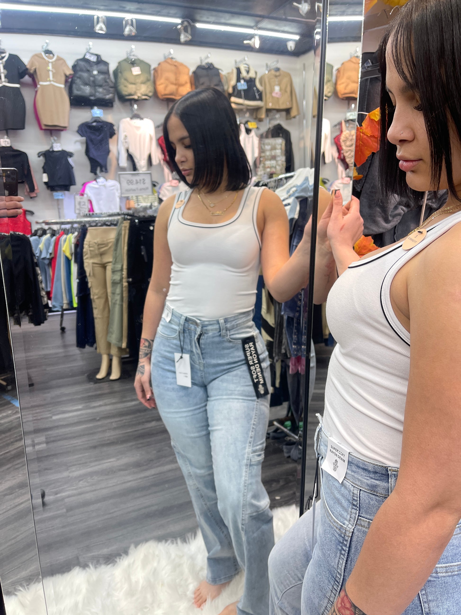 This white tank top features a stylish two-tone black design. Perfect for adding a touch of unique flair to any outfit. Stay cool and comfortable in this modern, minimalistic piece.
